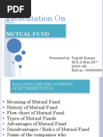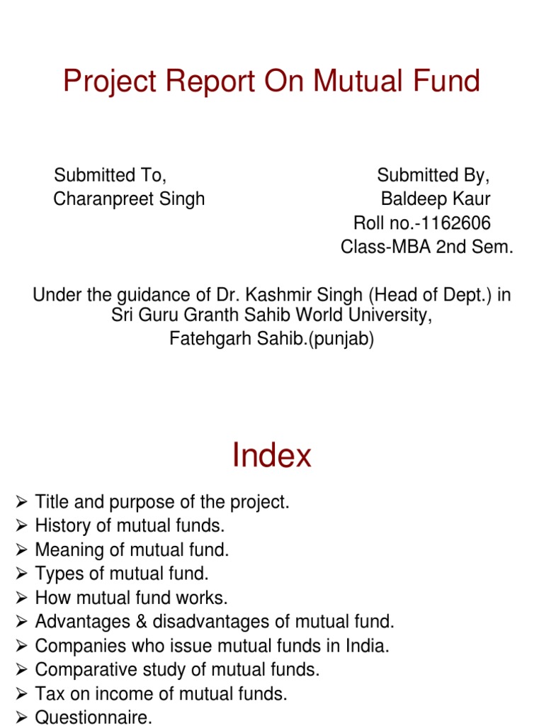 Title and purpose of the project. History of mutual funds. Meaning of mutual fund. Types of mutual fund. How mutual fund works. Advantages & disadvantages of mutual fund. Companies who issue mutual funds in India. Comparative study of mutual funds. Tax on income of mutual funds. Questionnaire. Solutions .