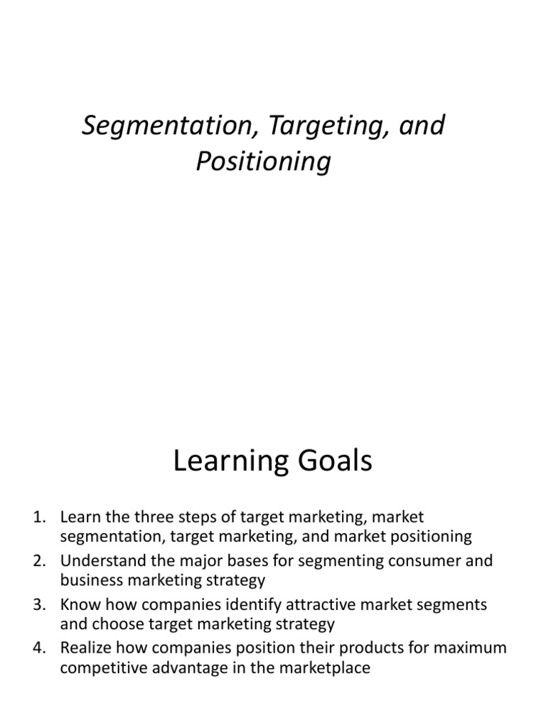 1. Learn the three steps of target marketing, market segmentation, target marketing, and market positioning 2. Understand the major bases for segmenting consumer and business marketing strategy 3. Know how companies identify attractive market segments and choose target marketing strategy 4. Realize how companies position their products for maximum competitive advantage in the marketplace