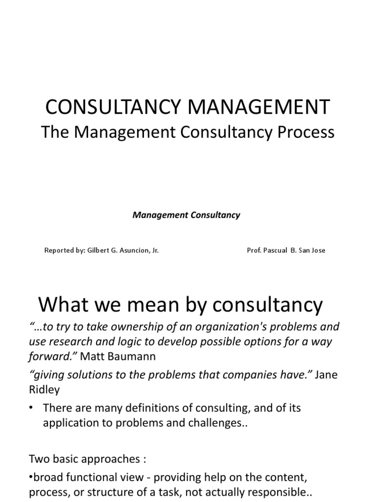 to try to take ownership of an organization's problems and use research and logic to develop possible options for a way forward. Matt Baumann giving solutions to the problems that companies have. Jane Ridley There are many definitions of consulting, and of its application to problems and challenges.. Two basic approaches : broad functional view - providing help on the content, process, or structure of a task, not actually responsible.. views consulting as a special professional service, advisory