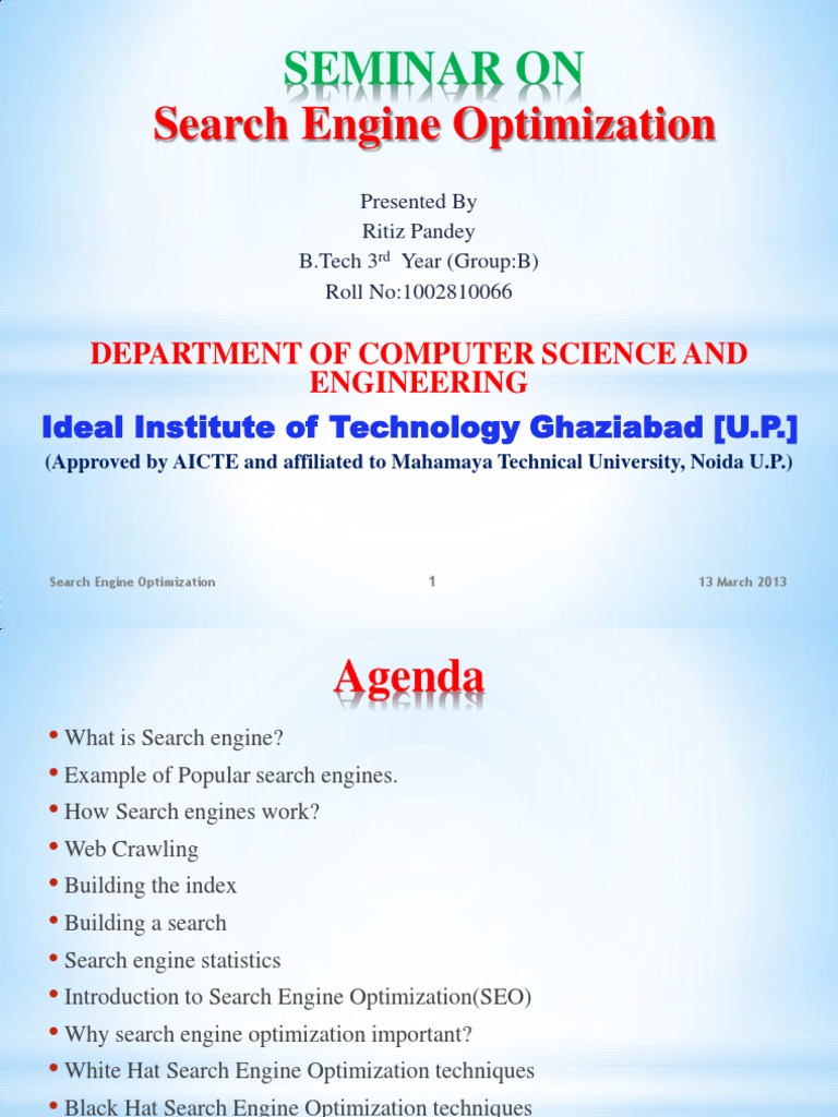 What is Search engine? Example of Popular search engines. How Search engines work? Web Crawling Building the index Building a search Search engine statistics Introduction to Search Engine Optimization(SEO) Why search engine optimization important? White Hat Search Engine Optimization techniques Black Hat Search Engine Optimization techniques Search Engine Optimization obstacles
