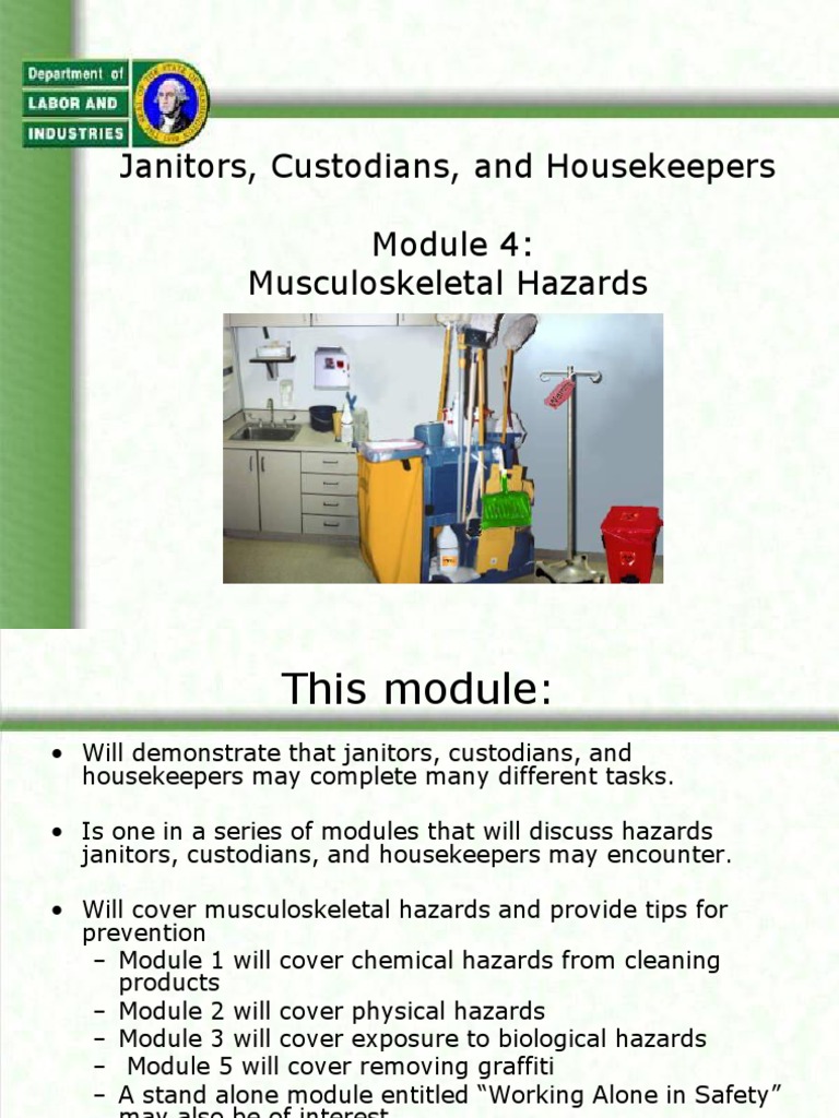 Is one in a series of modules that will discuss hazards janitors, custodians, and housekeepers may encounter.