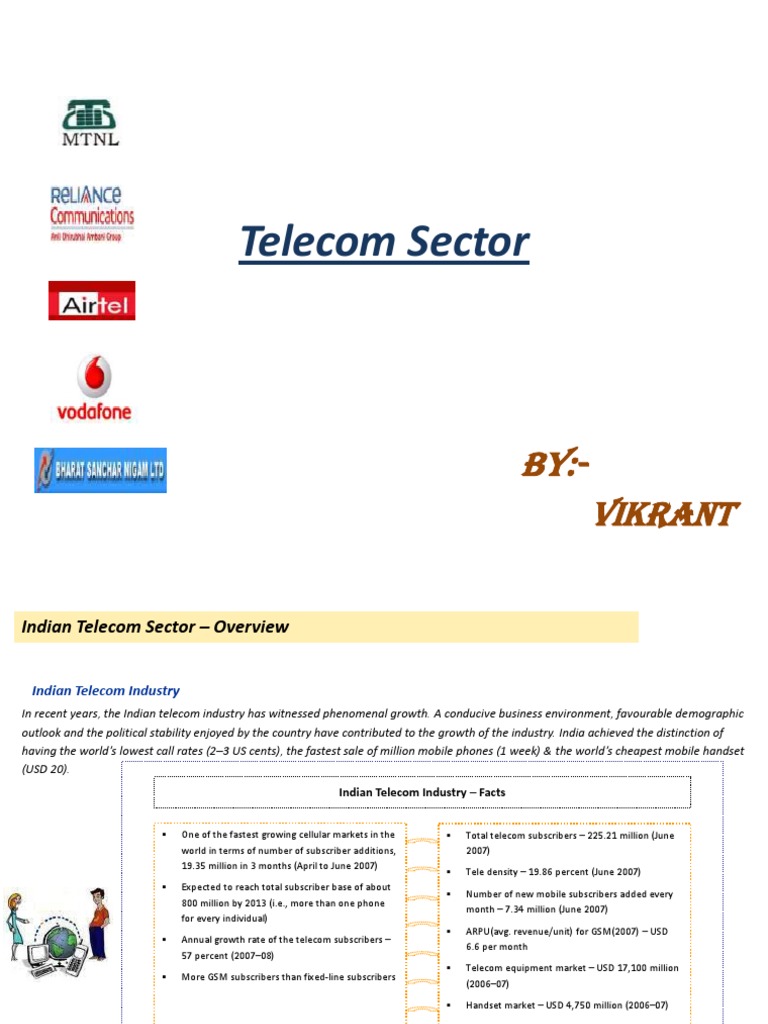 One of the fastest growing cellular markets in the world in terms of number of subscriber additions, 19.35 million in 3 months (April to June 2007) Expected to reach total subscriber base of about 800 million by 2013 (i.e., more than one phone for every individual) Total telecom subscribers 225.21 million (June 2007) Tele density 19.86 percent (June 2007) Number of new mobile subscribers added every month 7.34 million (June 2007) ARPU(avg. revenue/unit) for GSM(2007) USD 6.6 per month Telecom equipment market USD 17,100 million (200607) Handset market USD 4,750 million (200607)