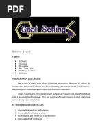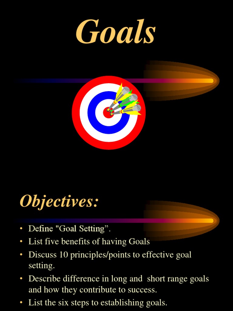 Define "Goal Setting. List five benefits of having Goals Discuss 10 principles/points to effective goal setting. Describe difference in long and short range goals and how they contribute to success. List the six steps to establishing goals. Identify eight goals for yourself. Describe how you can help students learn to set goals.