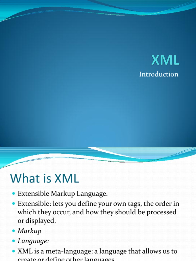 which they occur, and how they should be processed or displayed. Markup Language: XML is a meta-language: a language that allows us to create or define other languages.
