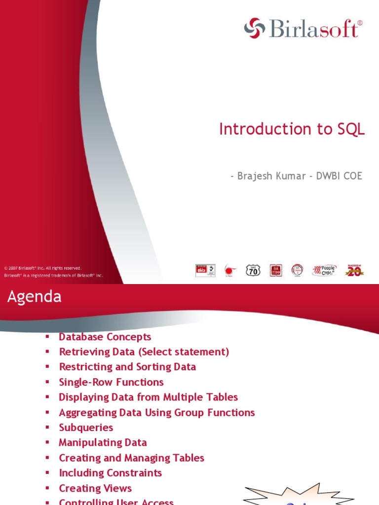 Database Concepts Retrieving Data (Select statement) Restricting and Sorting Data Single-Row Functions Displaying Data from Multiple Tables Aggregating Data Using Group Functions Subqueries Manipulating Data Creating and Managing Tables Including Constraints Creating Views Controlling User Access Using SET Operators Practice Exercise