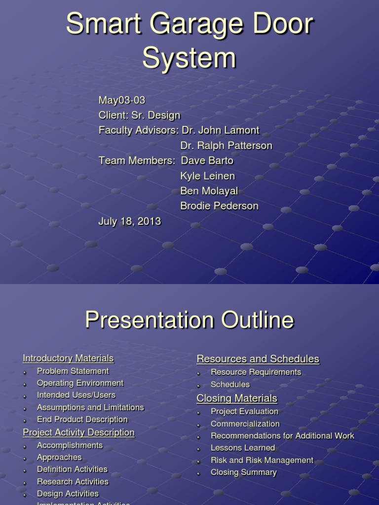 May03-03 Client: Sr. Design Faculty Advisors: Dr. John Lamont Dr. Ralph Patterson Team Members: Dave Barto Kyle Leinen Ben Molayal Brodie Pederson July 18, 2013
