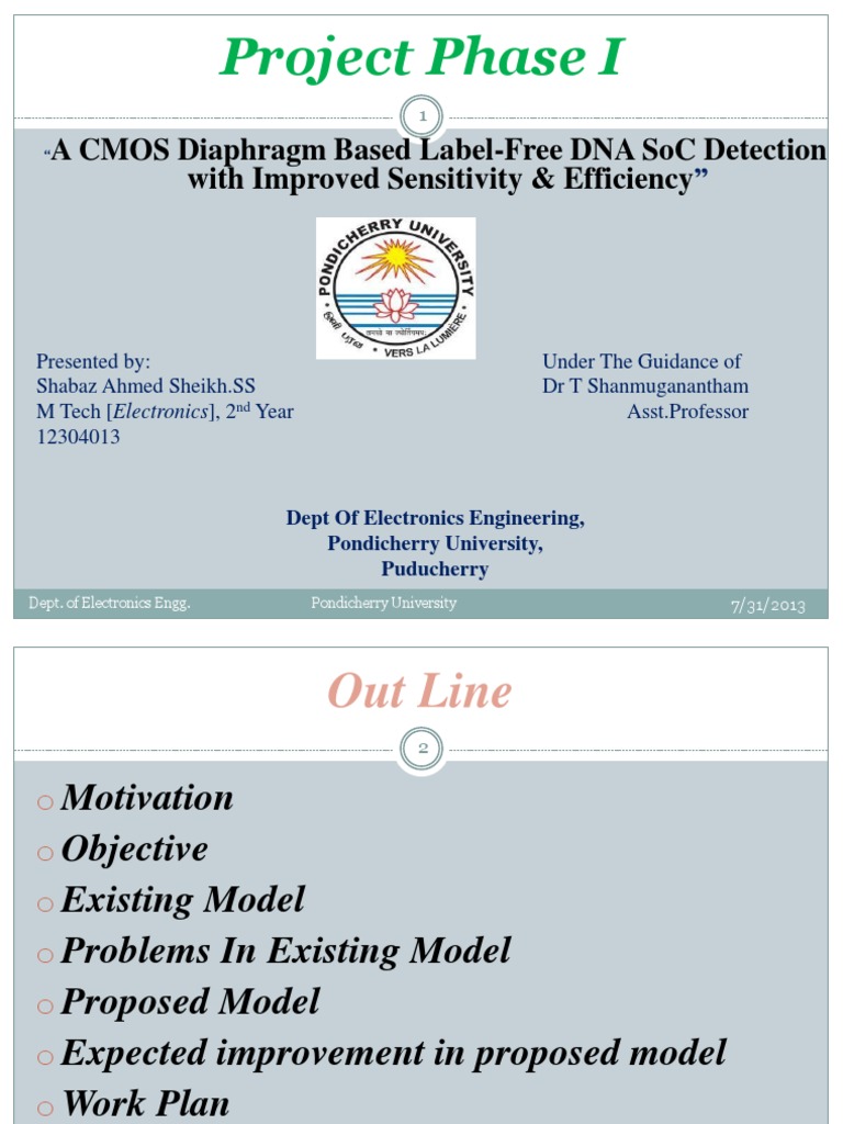Study of A CMOS Membrane/Diaphragm Based Label-Free DNA SoC Detection Easy disease diagnosis eg. CANCER,HEPATITIS,TB, Avian Flu The methodology of design new capacitance or membrane based DNA detection Description about the tool to simulate the model The parameters and the values of input voltage used to simulate the model The expected result for proposed model Report submission for the work so far done Explanations for the queries regarding the work 7/31/2013 so far done