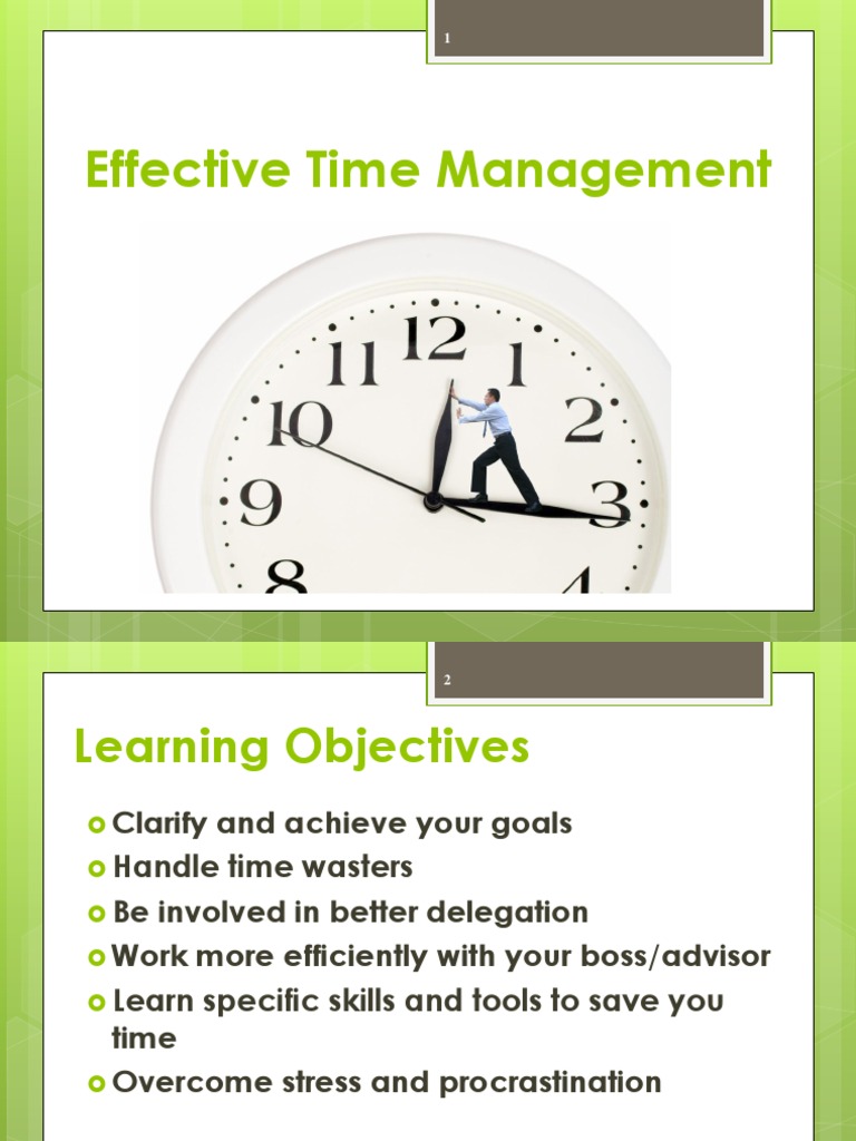 and achieve your goals Handle time wasters Be involved in better delegation Work more efficiently with your boss/advisor Learn specific skills and tools to save you time Overcome stress and procrastination