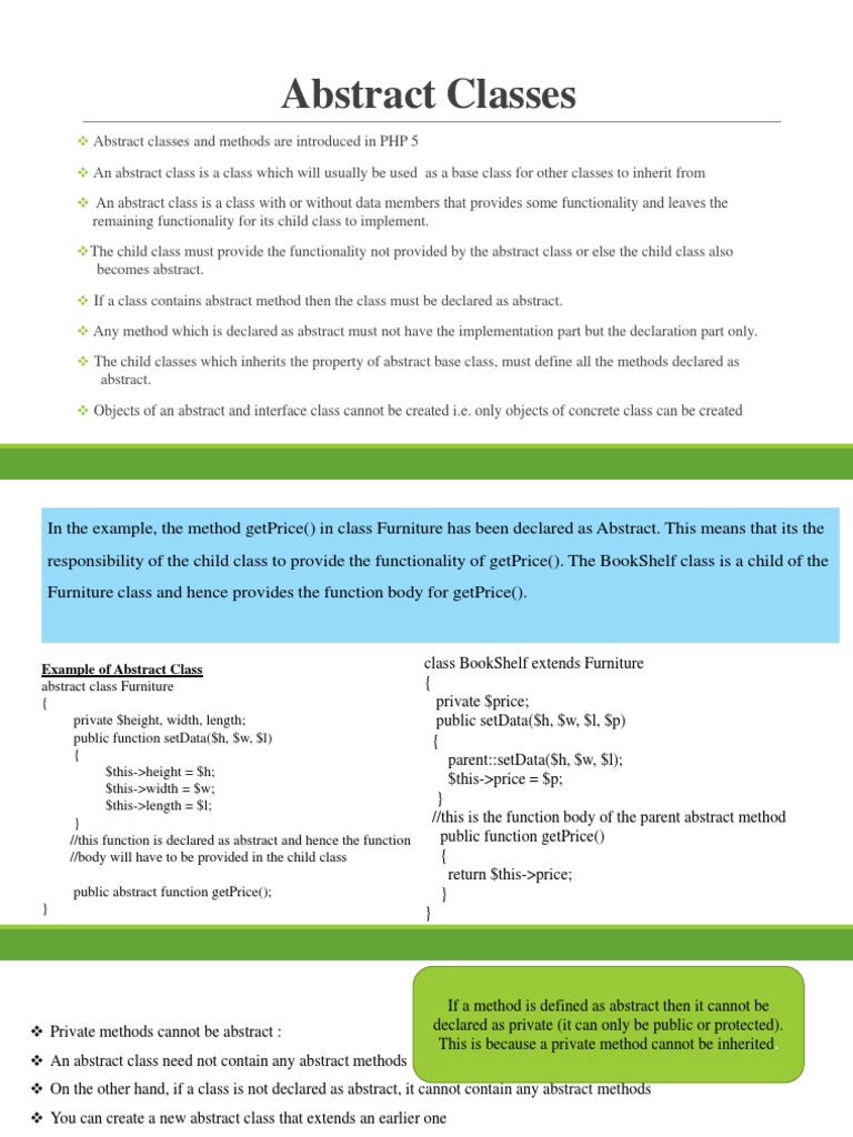 protected abstract function can be implemented as either protected or public but not private. 8. Declaring functions as static abstract throws a strict warning in PHP 5.2 or earlier, however, as of PHP 5.3 this is allowed.