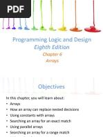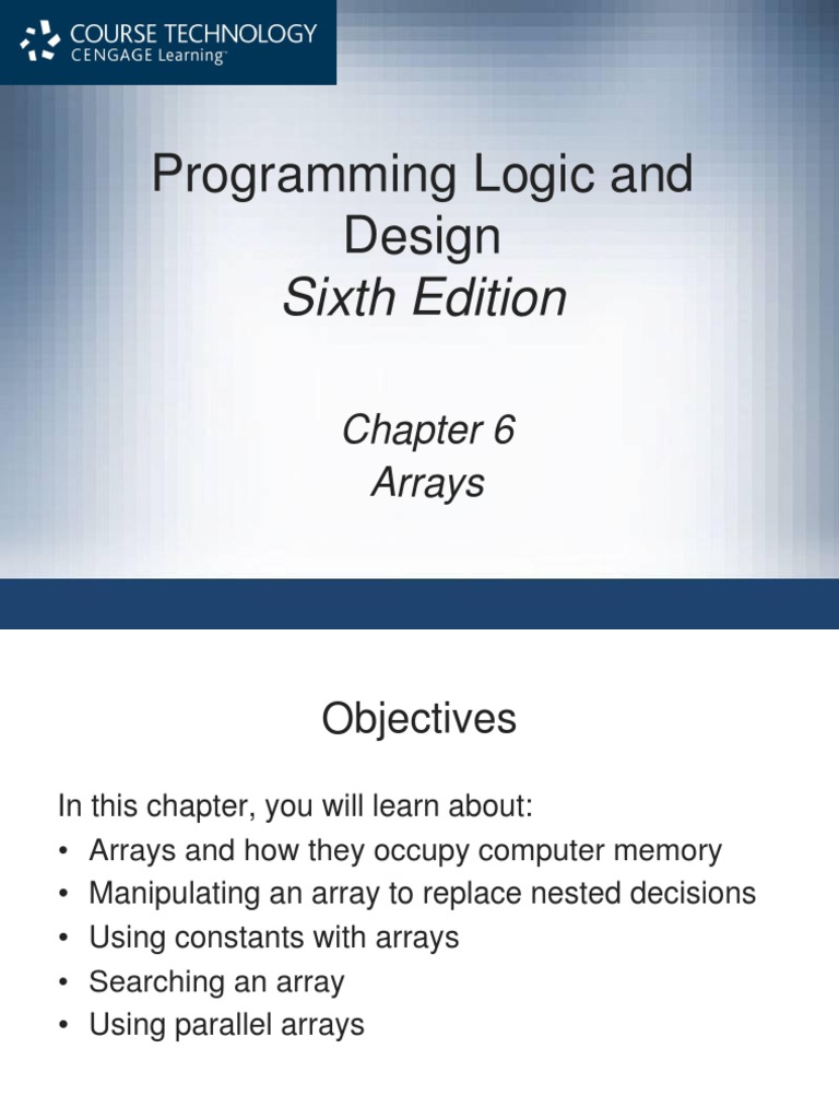 In this chapter, you will learn about: Arrays and how they occupy computer memory Manipulating an array to replace nested decisions Using constants with arrays Searching an array Using parallel arrays