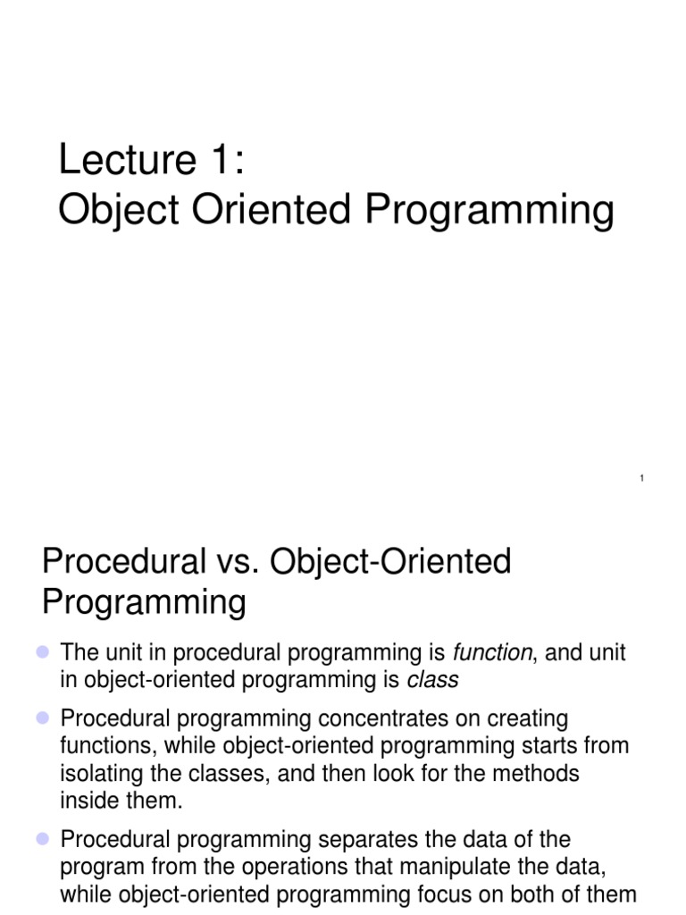 The unit in procedural programming is function, and unit in object-oriented programming is class Procedural programming concentrates on creating functions, while object-oriented programming starts from isolating the classes, and then look for the methods inside them. Procedural programming separates the data of the program from the operations that manipulate the data, while object-oriented programming focus on both of them