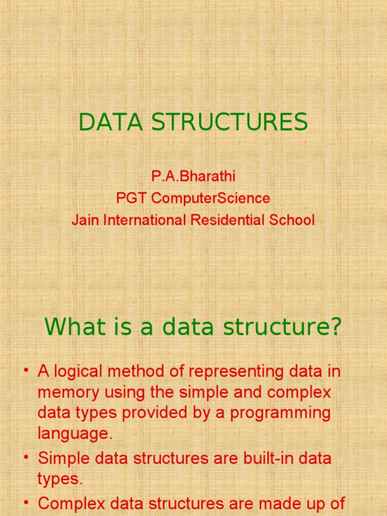 A logical method of representing data in memory using the simple and comple data types pro!ided "y a programming language. Simple data structures are "uilt#in data types. Comple data structures are made up of simple data types.