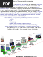 Concurrent engineering is a dynamic approach to integrated product development that emphasis on the response to customer expectations. it embodies team values of cooperation, trust and sharing, in such a manner that decisions making is by consensus, involving all perspectives in parallel, from the beginning of the product lifecycle.