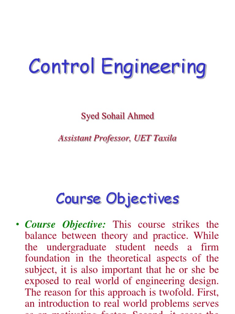 Course Objective: This course strikes the balance between theory and practice. While the undergraduate student needs a firm foundation in the theoretical aspects of the subject, it is also important that he or she be exposed to real world of engineering design. The reason for this approach is twofold. First, an introduction to real world problems serves as an motivating factor. Second, it eases the transition from academia to industry.