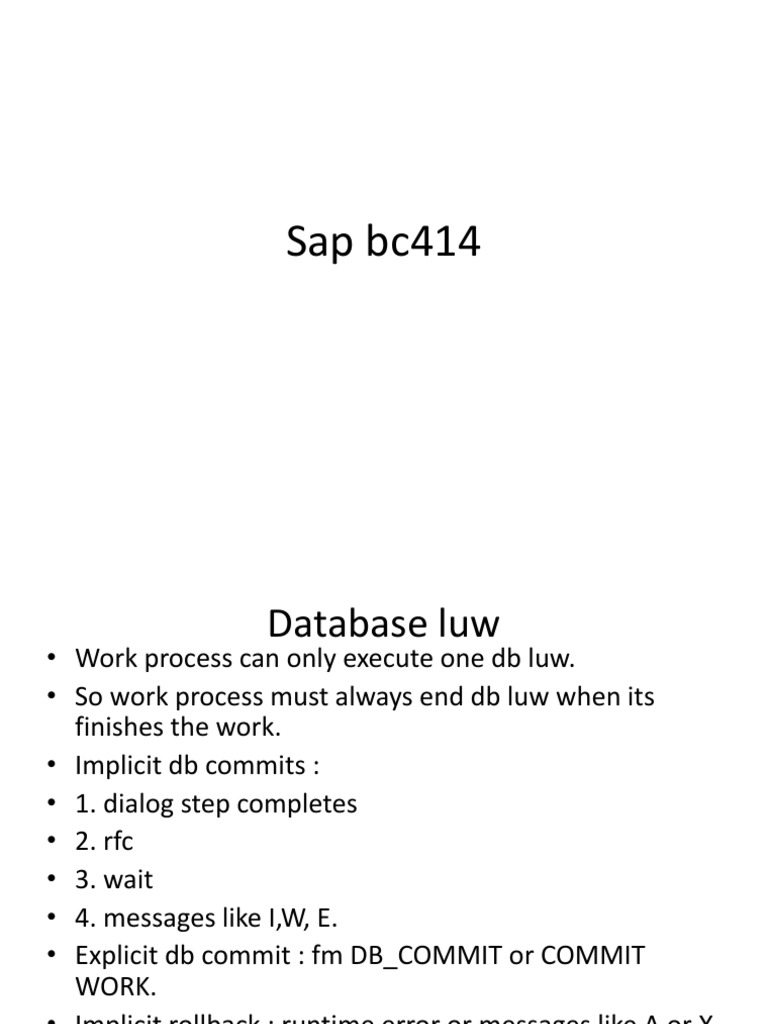 Work process can only execute one db luw. So work process must always end db luw when its finishes the work. Implicit db commits : 1. dialog step completes 2. rfc 3. wait 4. messages like I,W, E. Explicit db commit : fm DB_COMMIT or COMMIT WORK. Implicit rollback : runtime error or messages like A or X. Explicit rollback : ROLLBACK WORK.