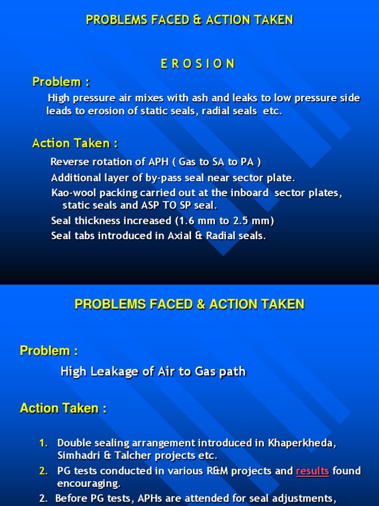 1. Double sealing arrangement introduced in Khaperkheda, Simhadri & Talcher projects etc. 2. PG tests conducted in various R&M projects and results found encouraging. 2. Before PG tests, APHs are attended for seal adjustments, issued Technical Directive regarding Leakage & necessary operations.