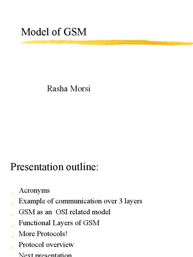 Acronyms Example of communication over 3 layers GSM as an OSI related model unctional !ayers of GSM More Protocols" Protocol overvie# $ext presentation References