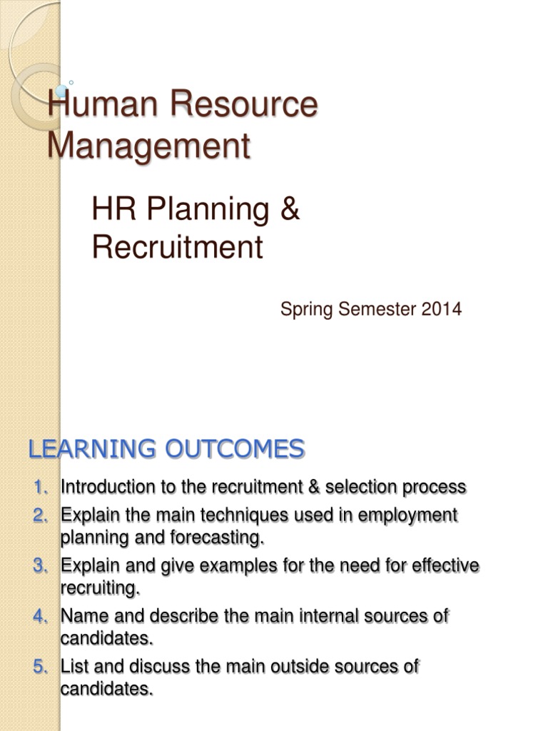 1. Introduction to the recruitment & selection process 2. Explain the main techniques used in employment planning and forecasting. 3. Explain and give examples for the need for effective recruiting. 4. Name and describe the main internal sources of candidates. 5. List and discuss the main outside sources of candidates.