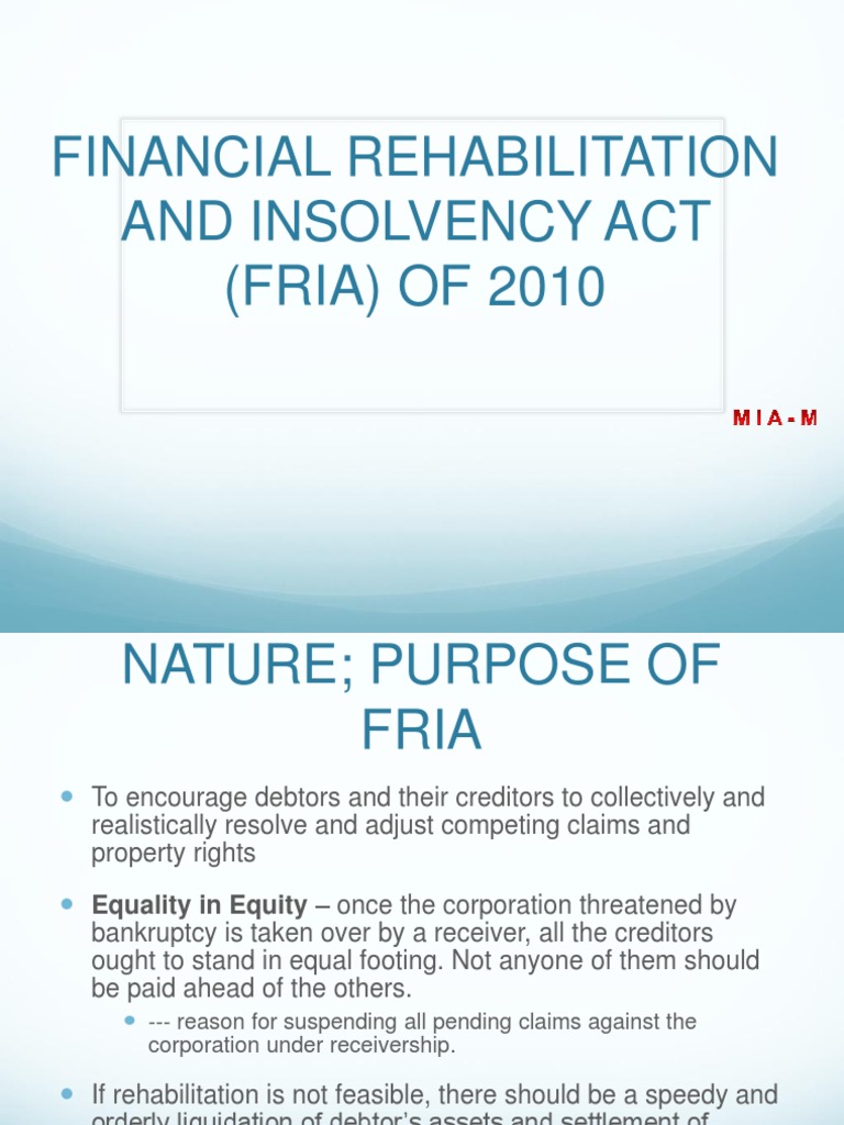 Under the Financial Rehabilitation and Insolvency Act (FRIA), the filing of a