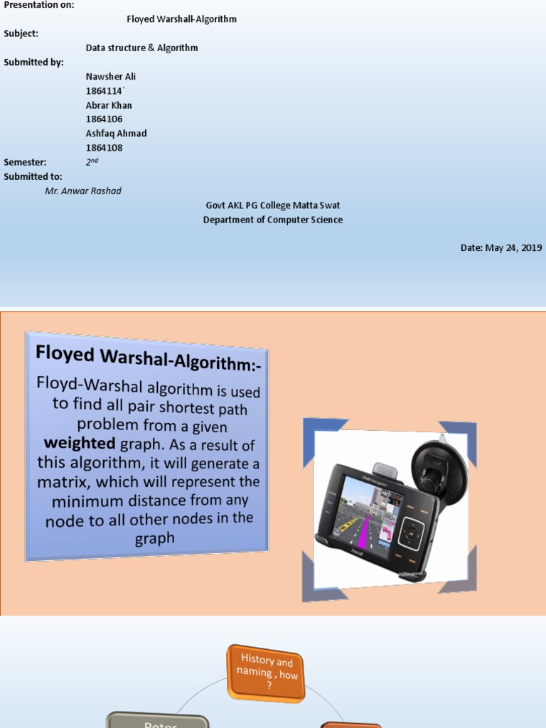 • Use Floyd-Warshal algorithm to find the shortest path between every pair of vertices in the following graph.