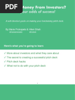14) The Ask: Capital Raise / $ Uses / Intros Size vs. Target Client, Your Solution (1-5), Traction