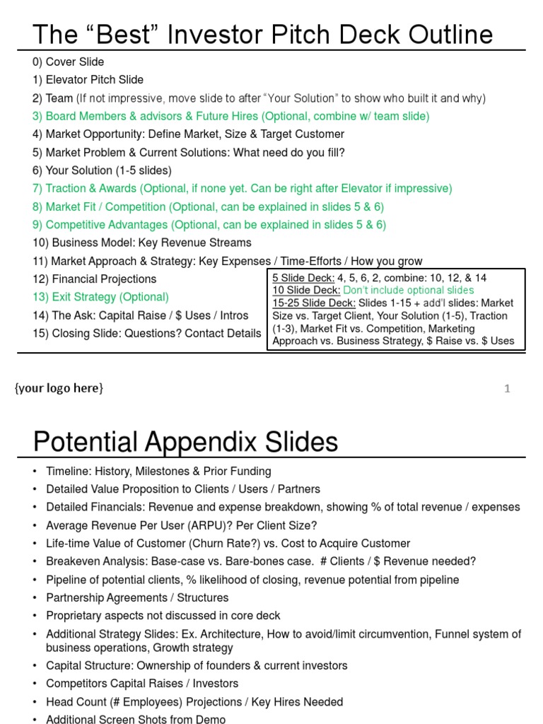 13) Exit Strategy (Optional) 15-25 Slide Deck: Slides 1-15 + add’l slides: Market