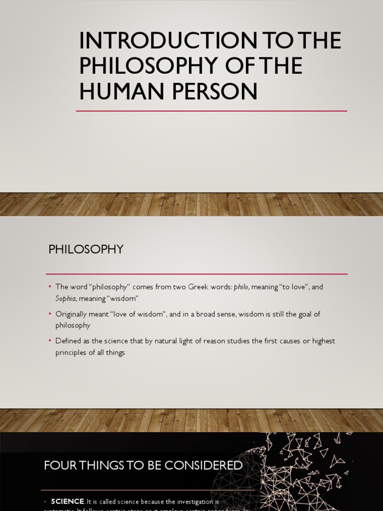 • The word “philosophy” comes from two Greek words: philo, meaning “to love”, and