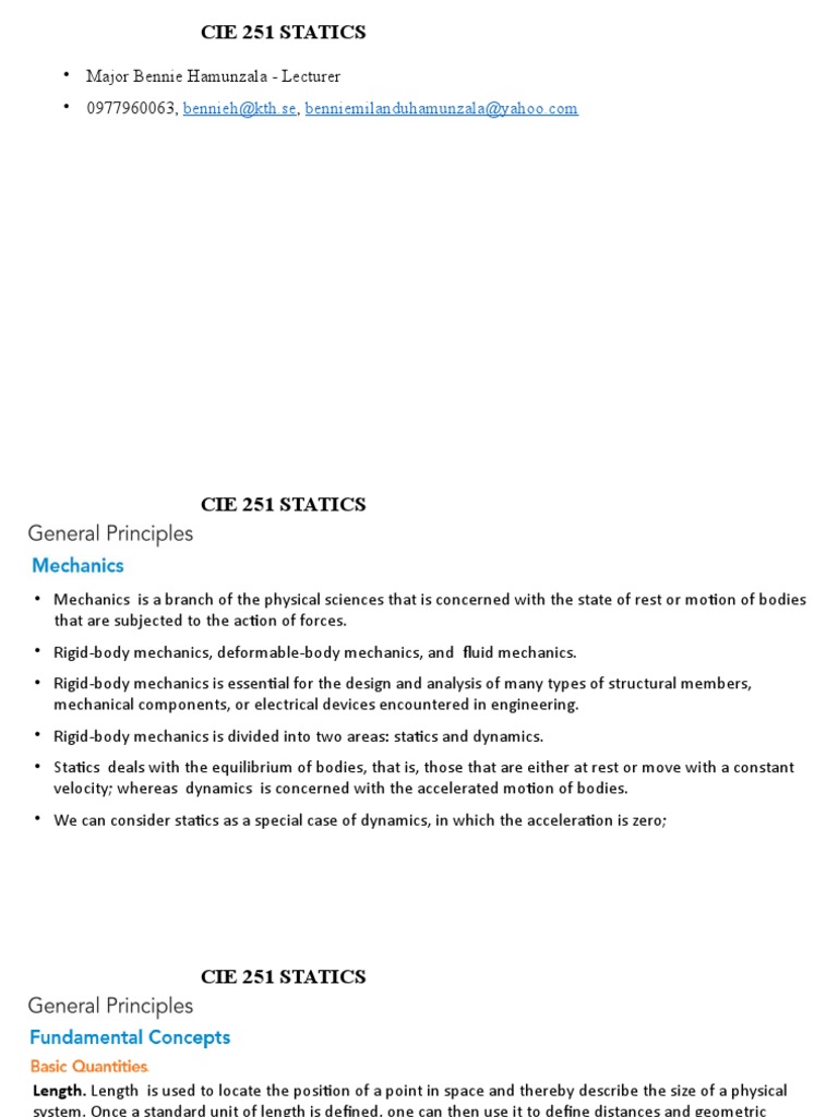 • Rigid-body mechanics is divided into two areas: statics and dynamics.
