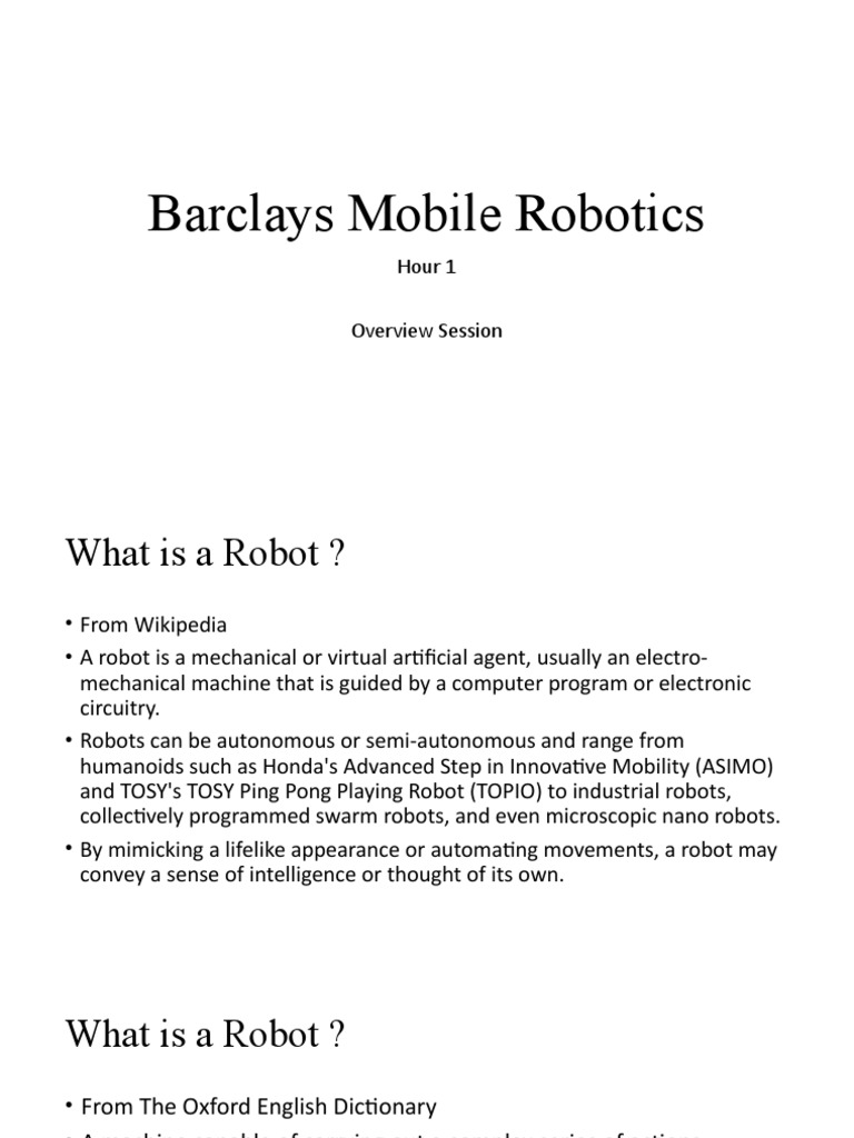 • A robot is a mechanical or virtual artificial agent, usually an electro-