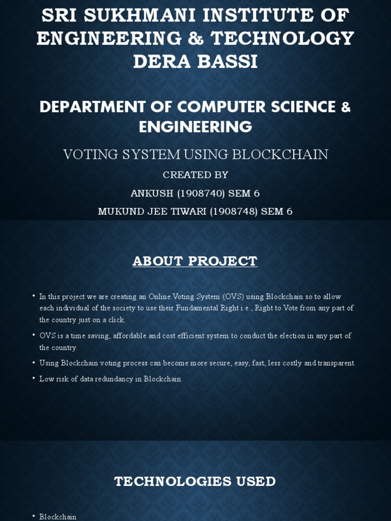 • In this project we are creating an Online Voting System (OVS) using Blockchain so to allow