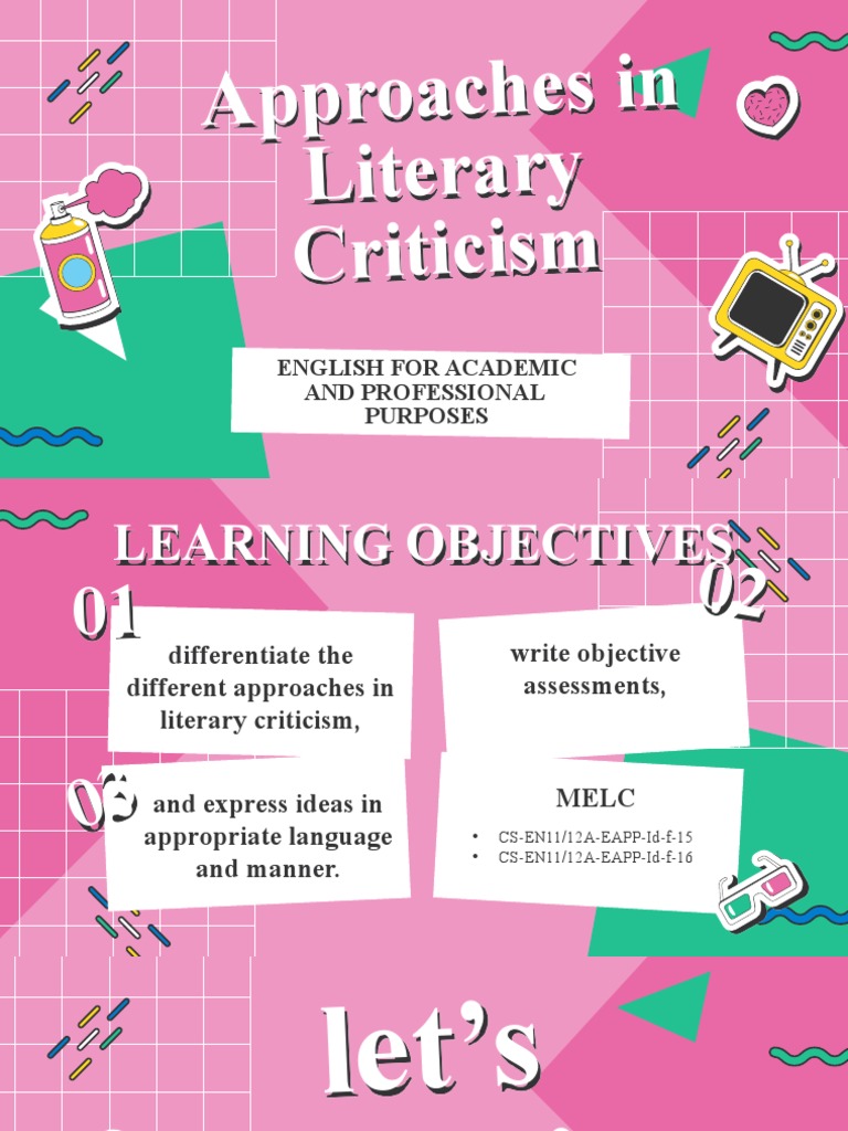 elements, choice of words (for writing) or medium (for artworks), relevance, timeliness