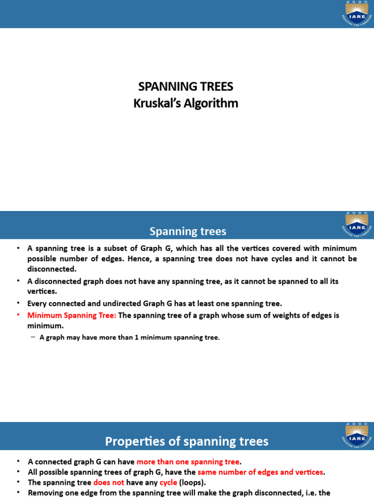 • A spanning tree is a subset of Graph G, which has all the vertices covered with minimum
