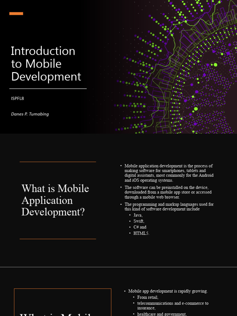 • Mobile app development refers to the process of creating software applications that run on mobile