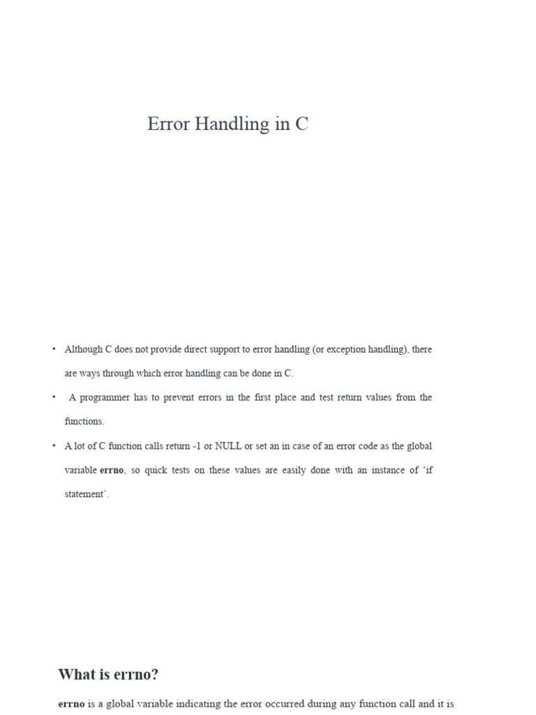 The strerror() function is also used to show the error description. This function returns a pointer to