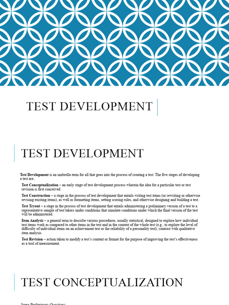 Test Development is an umbrella term for all that goes into the process of creating a test. The five stages of developing