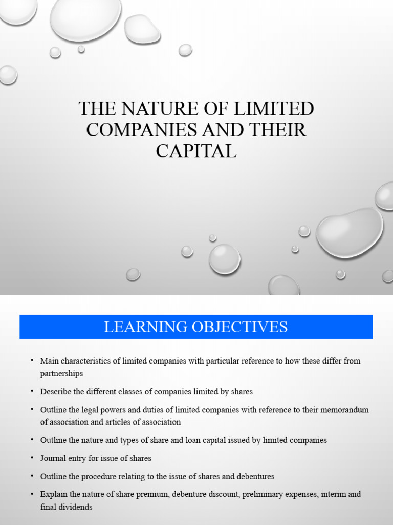 • Explain the nature of share premium, debenture discount, preliminary expenses, interim and