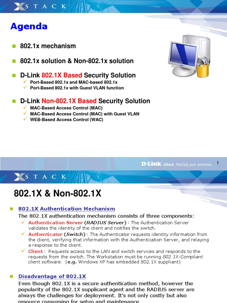 802.1x mechanism 802.1x solution & Non-802.1x solution D-Link 802.1X Based Security Solution Port-Based 802.1x and MAC-based 802.1x Port-Based 802.1x with Guest VLAN function D-Link Non-802.1X Based Security Solution