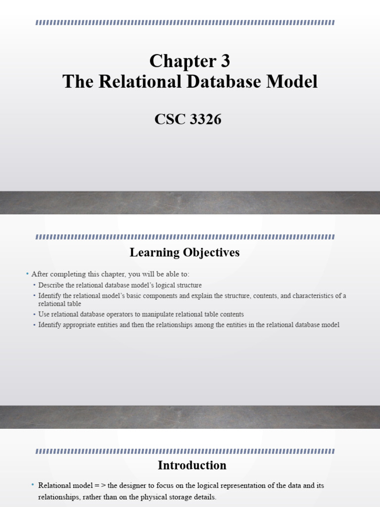 • Identify the relational model’s basic components and explain the structure, contents, and characteristics of a
