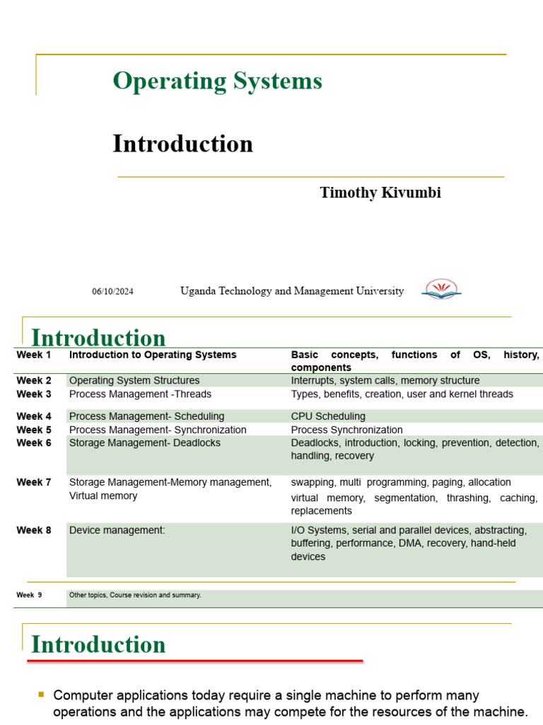 Week 1 Introduction to Operating Systems Basic concepts, functions of OS, history,