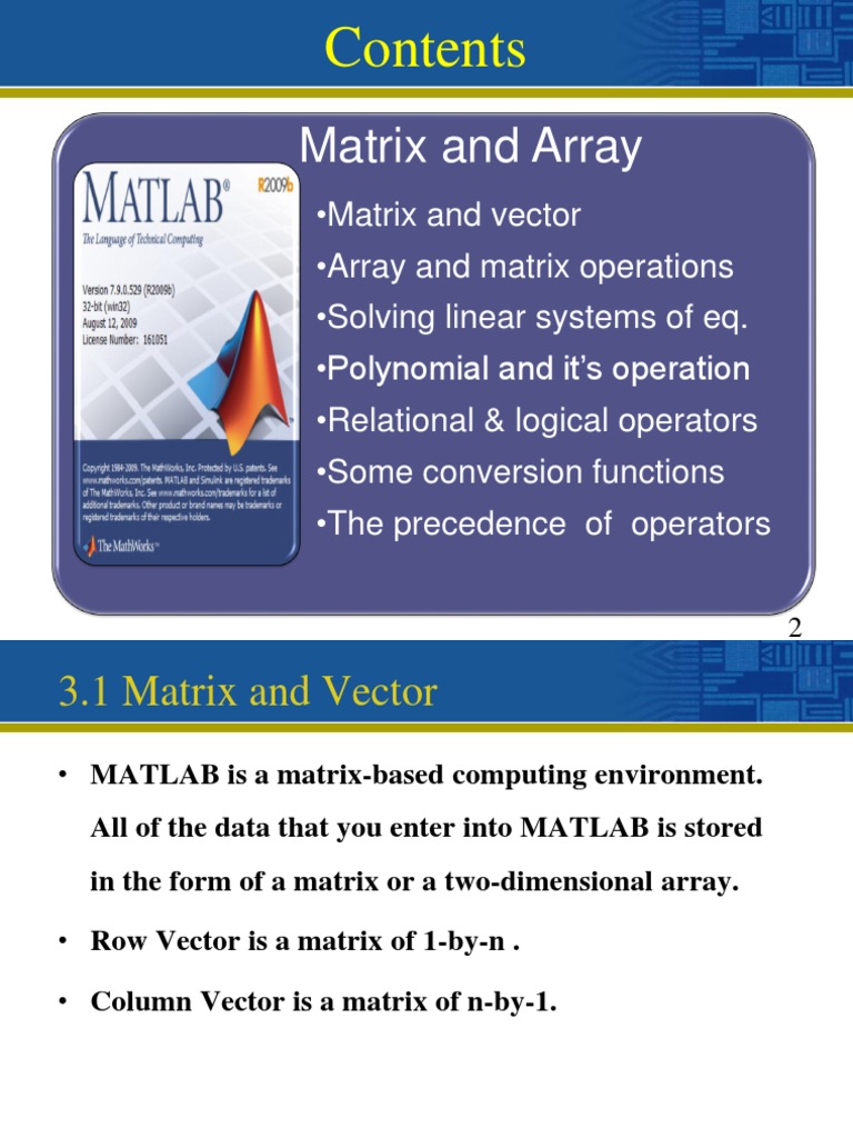 Matrix and vector Array and matrix operations Solving linear systems of eq. Polynomial and its operation Relational & logical operators Some conversion functions The precedence of operators