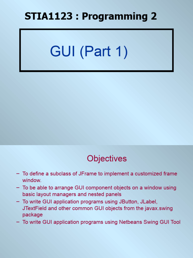 – To write GUI application programs using Netbeans Swing GUI Tool