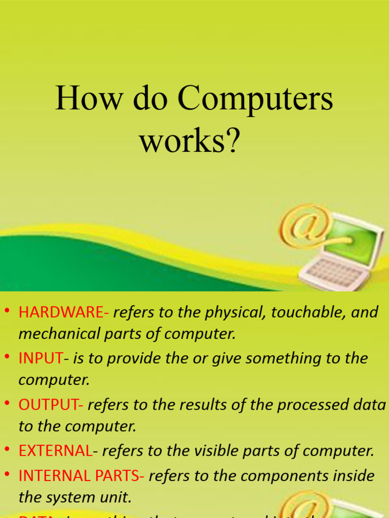 Direction: Name the Computer parts. Classify the internal and external Hardware