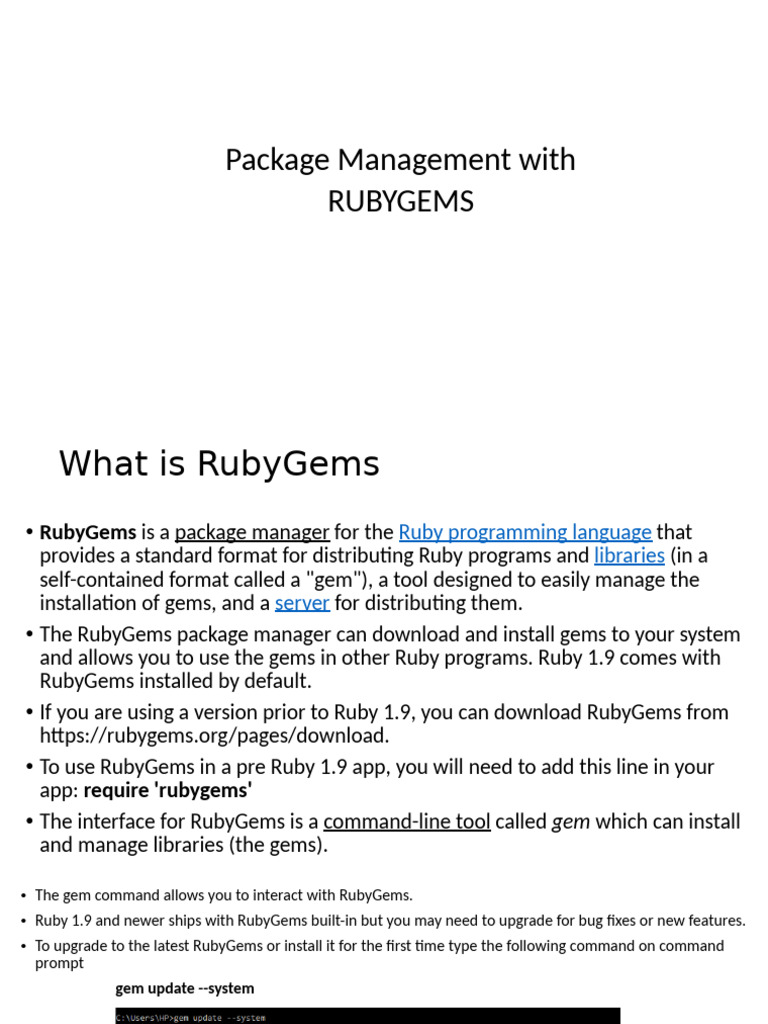 • Ruby 1.9 and newer ships with RubyGems built-in but you may need to upgrade for bug fixes or new features.
