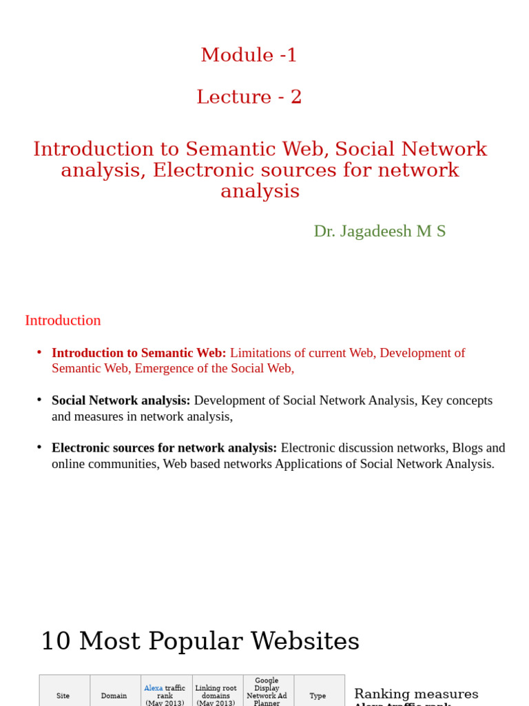 • Introduction to Semantic Web: Limitations of current Web, Development of