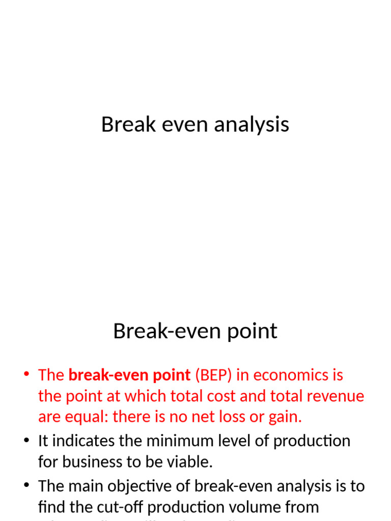 • BEP = 400000/ ( 500 – 300) = 2,000 units