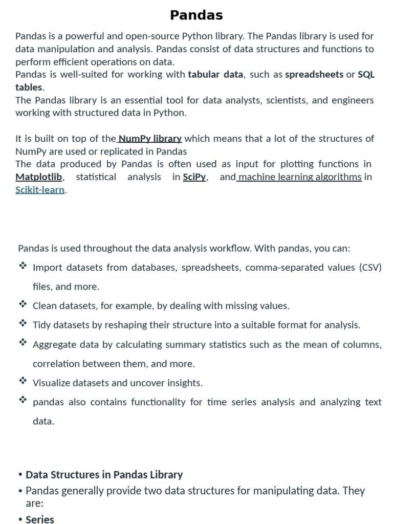 data manipulation and analysis. Pandas consist of data structures and functions to