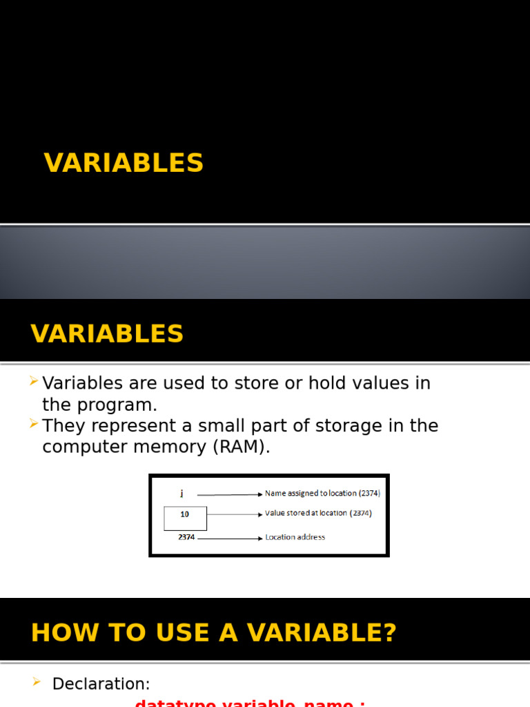 Variablesare used to store or hold values in