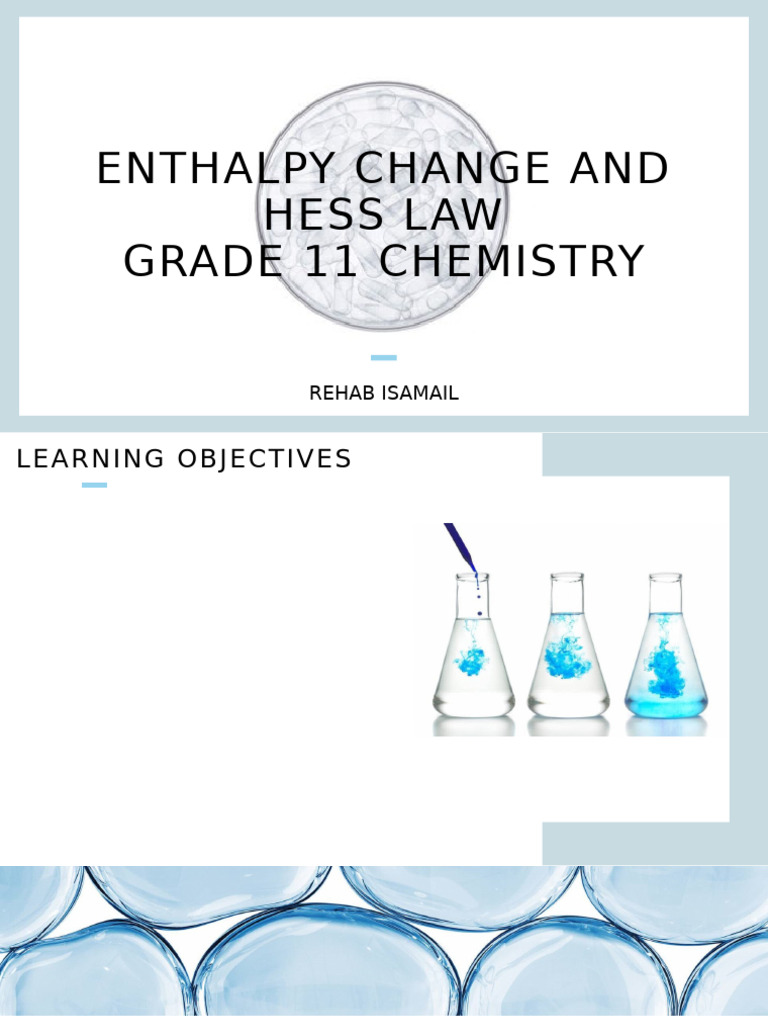 The document discusses the concepts of enthalpy change and Hess's Law as part of Grade 11 Chemistry. It outlines learning objectives related to these topics. The content is authored by Rehab Ismail.