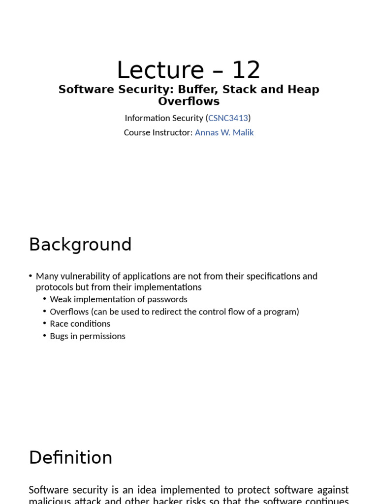 • Buffer, stack, and heap overflows are common vulnerabilities in