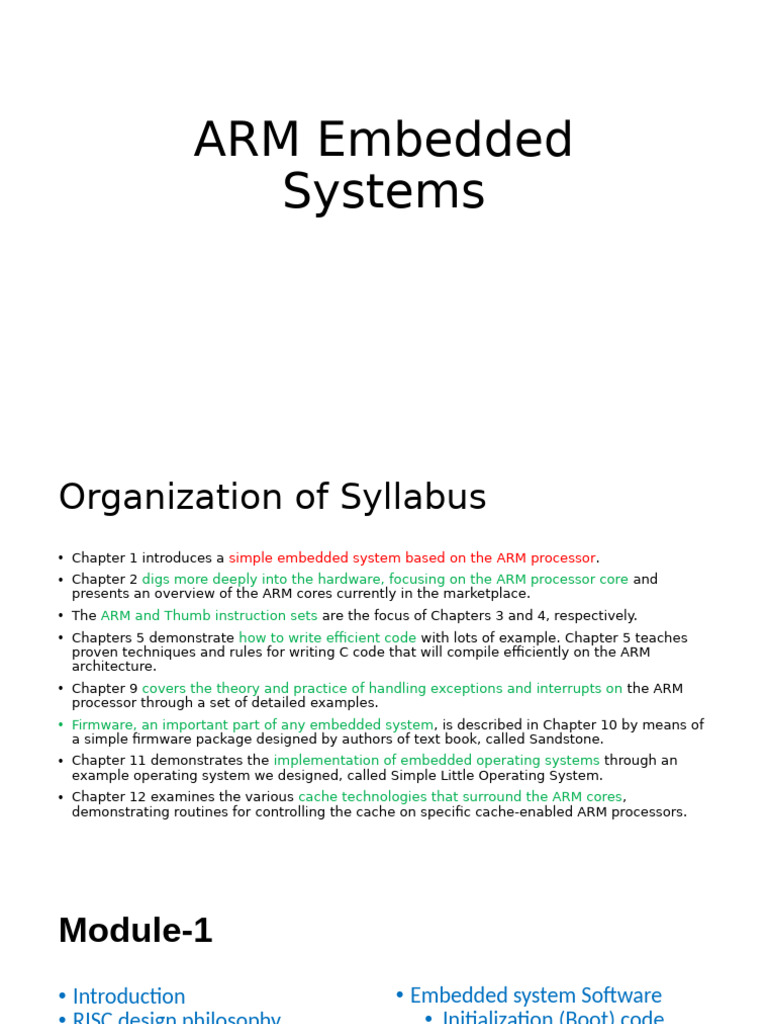 • Chapter 1 introduces a simple embedded system based on the ARM processor.